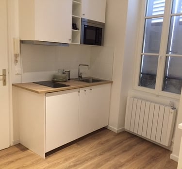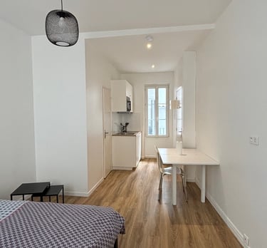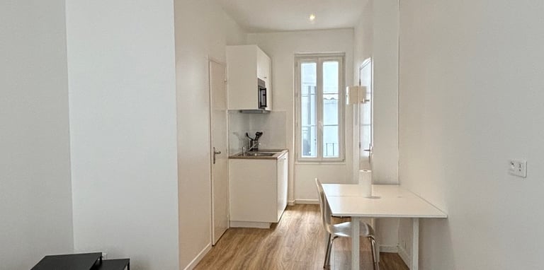Studio de 14,33 m² dans le vieux Vichy, entièrement équipé : plaque de cuisson, hotte, micro-ondes, réfrigérateur avec compartiment congélateur intégré, table repas, lit 90, grande douche, meuble lavabo, sèche-serviette. Abri vélo inclus.