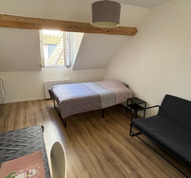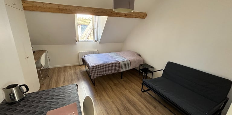 Studio mansardé 24m2 (16,5m2 habitable), proche du pôle universitaire Lardy, très calme, idéal étudiant, rénové et équipé : plaque cuisson, micro-onde, frigo intégré, lave-linge, salle d'eau équipé (douche, meuble lavabo, radiateur), table repas, bureau, sofa, lit 120, placard. Abri vélo dans la cour.