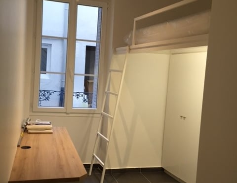 Studio 21m2, calme, traversant, idéal étudiant, coin nuit séparé, rénové et tout équipé : plaque cuisson, hotte, four micro-onde, frigo intégré, lave-linge, salle d'eau (douche, radiateur sèche serviette), table repas, bureau, sofa, prise TNT, lit 140 en mezzanine, grands placards, sofa. Abri vélo.