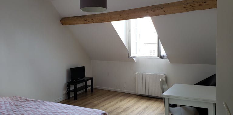 Studio mansardé 23,52m2 (16,07m2 habitable), proche du pôle universitaire Lardy, très calme, idéal étudiant, rénové et équipé : plaque cuisson, micro-onde, frigo intégré, lave-linge, salle d'eau équipé (douche, meuble lavabo, radiateur), table repas, bureau, sofa, lit 120, placard. Abri vélo dans la cour.