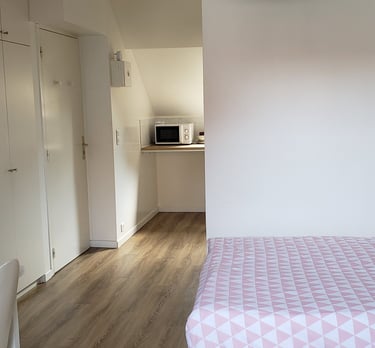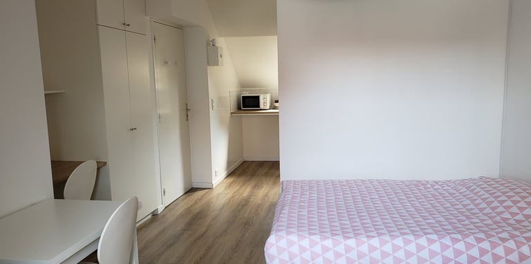Studio mansardé 24m2 (19m2 habitable), proche du pôle universitaire Lardy, très calme, idéal étudiant, rénové et équipé : plaque cuisson, micro-onde, frigo intégré, lave-linge, salle d'eau équipé (douche, meuble lavabo, radiateur), table repas, bureau, sofa, lit 140, placard. Abri vélo dans la cour.